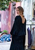 | w/ her red ribbon, again, too, black, satin gown, and cap, w/ red sash |